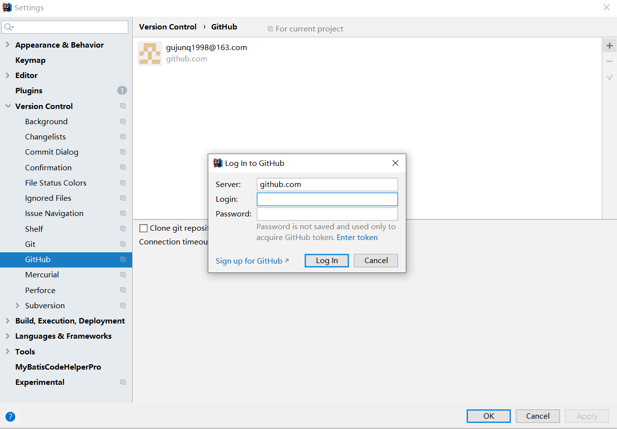 - 在 Version Control 中选择 Github 点击右上方的加号,在弹出的界面中添加自己的 github 账号和密码,如下图 2 所示,显示出自己的 github 账号表示成功。
