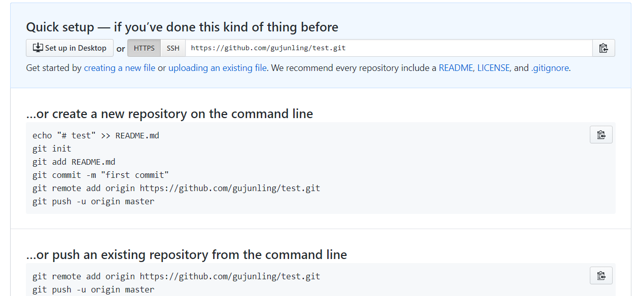 - 注意 : 在 github 上创建远程仓库后,会自动生成 URL,在 idea 上传到 github 上时会用到,例如,上图中我的 URL 为: https://github.com/gujunling/test.git