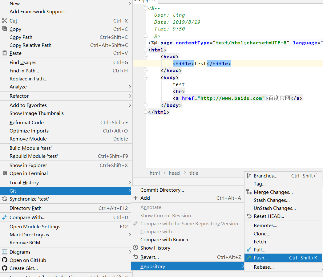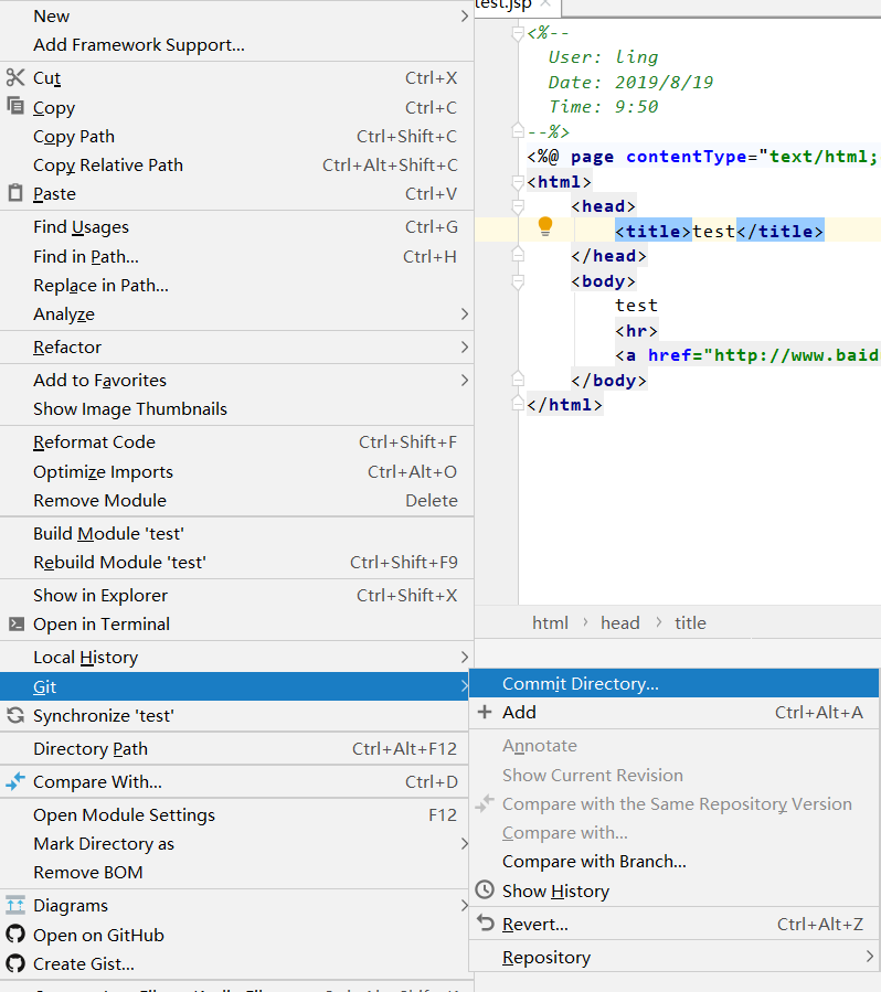 - 右击项目选择 Git ---> Commit Directory ,将该项目提交到本地仓库,如下图 5 所示。