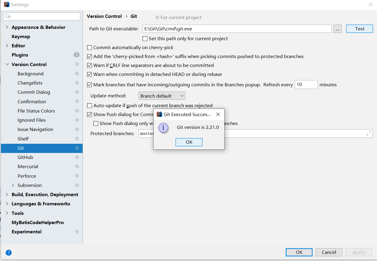 - 依次选择 File ---> Settings ---> Version Control ---> Git 在 Path to Git executable 中选择自己安装的 git 的路径,然后可以点击右边的 Test 测试,出现 git 的版本表示成功,如下图 1 所示。