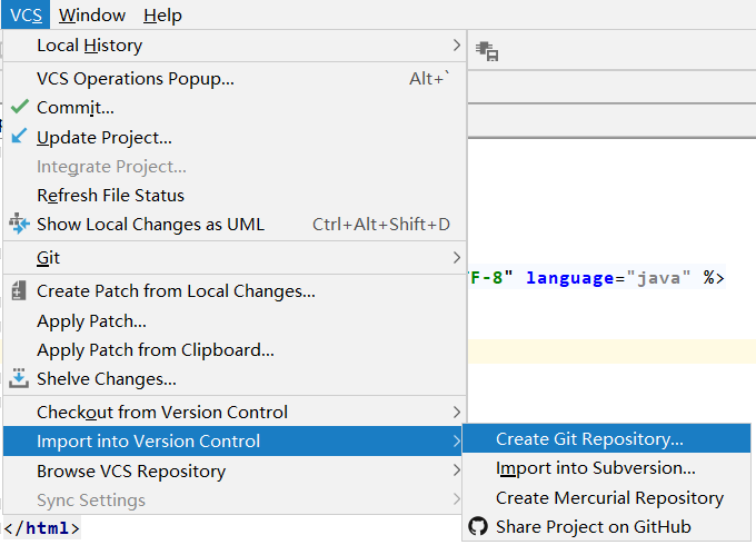 - 在 idea 上方依次选择 VCS ---> Import into Version Control ---> Create Git Repository , 如图 3 所示,点击 Create Git Repository,出现如下图 3 所示