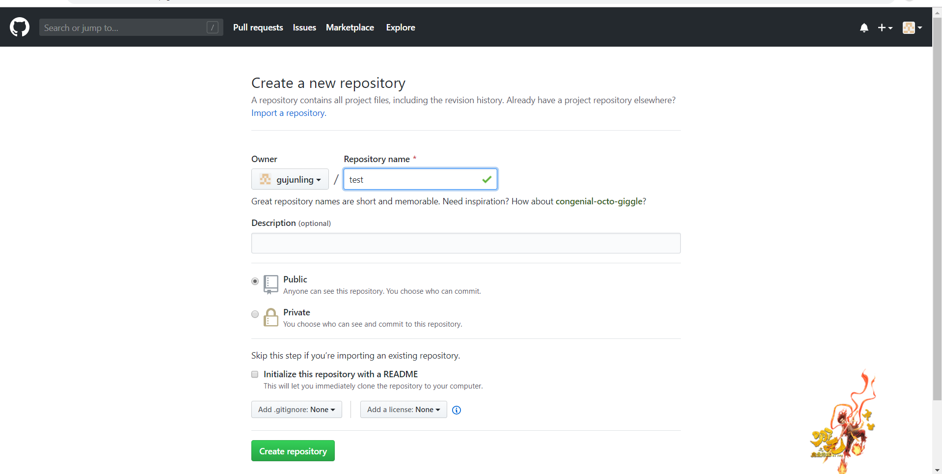 在 github 的右上角,点击加号下方的 New repository --> 在 Repository name 输入框中输入远程仓库名 ---->在 Description (optional)输入框中添加对项目的描述 --->然后点击下方的绿色按钮,创建远程仓库完成。