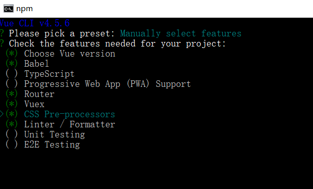 向上向下箭头控制方向,空格进行选中,可选择如下配置,引入 Router 和 Vuex 以及 CSS 预处理器,选择完成回车即可