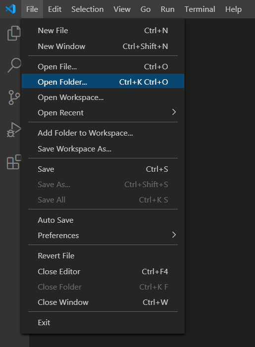 在页面左上角选择 File,在下拉菜单中选择 Open Folder(打开文件夹)