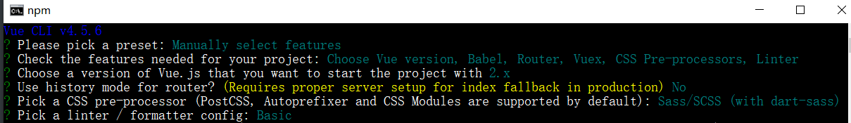 出现下图所示表示 Vue 脚手架(Vue-CLI4.5)安装成功