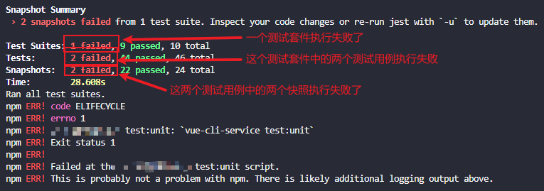 若测试用例执行失败,即执行上述命令后出现 failed,则根据报错信息查看具体问题,在单元测试中,如果没有通过测试,要么是因为测试的对象有问题,或者是测试代码有问题。