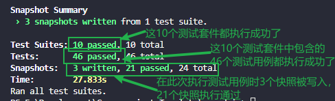 测试结果中,成功的用例会用绿色表示,而失败的部分会显示为红色,若出现如下图所示(没有出现 failed),则表示执行测试用例成功。生成快照后会在index.spec.js的同级目录下自动创建一个新目录__snapshots__,在此目录下存放保存快照所生成的 HTML 代码。