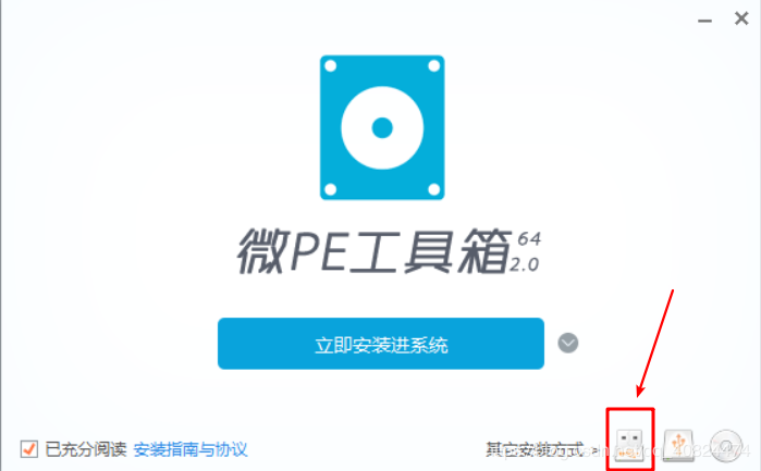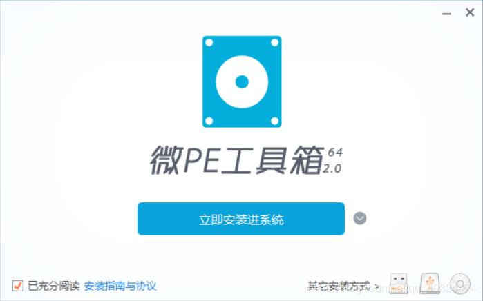 # 1、首先将 U 盘插入到电脑,然后双击 WePE_64_V2.0.exe 文件,启动微 PE 工具箱程序,来的主界面,如下图所示: