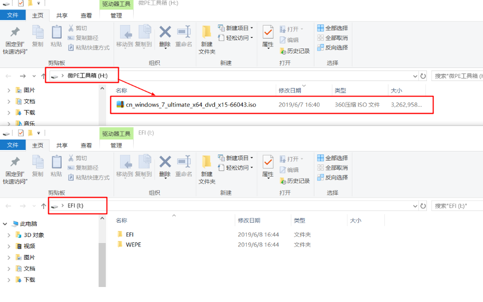 # 5、微 PE 制作 U 盘启动盘成功后,原来的 U 盘会变成如下图形态,将 Windows 系统镜像拷贝到对应文件夹下(原 U 盘)即可。