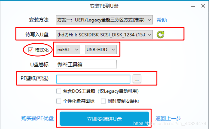 # 3、点击后进入 U 盘制作界面,此时工具箱会自动识别 U 盘信息,此时我们需要选择一些自己需要的制作信息,安装方法默认推荐的即可,默认格式化,格式化后的 U 盘格式有三种,推荐的也是默认的 exFAT 格式,U 盘运行模式为 USB-HDD,U 盘卷标可以自己取名字,PE 壁纸可以自选(重装系统时进入的引导页面的壁纸),其他默认即可。