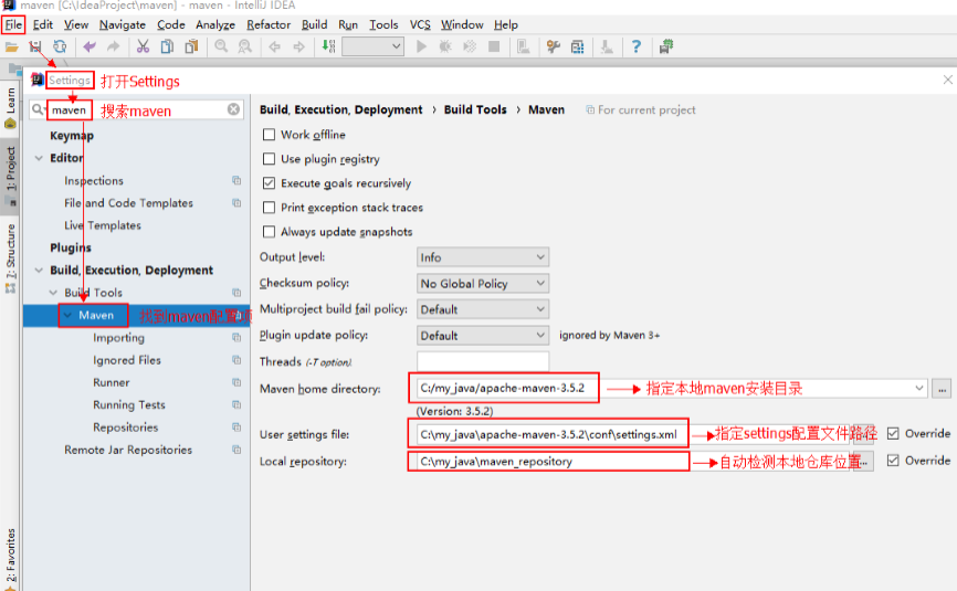 在打开项目的情况下依次选择--->File--->Settings--->Build,Execution,Deployment--->Build Tools--->maven